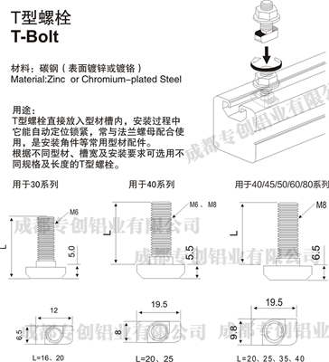 T型螺栓直接放入型材槽內(nèi),安裝過程中它能自動定位鎖緊,常與法蘭螺母配合使用,是安裝角件等常用型材配件。根據(jù)不同型材、槽寬及安裝要求可選用不同規(guī)格及長度的T型螺栓。
