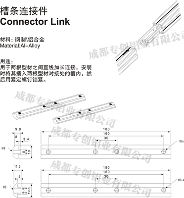 用于兩根型材之間直線加長連接,安裝時將其插入兩個型材對接處的槽內,然后用緊定螺釘鎖緊。